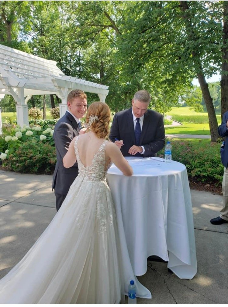 [This photo] shows me signing the marriage certificate for my niece and her new husband at their wedding on July 3 in Hennepin County, MN.  She asked me to officiate her wedding last year.  That is when I reached out to CGOM to obtain my ordination credentials so that I could officially conduct that wedding ceremony.  Everyone present (which was only 17 people due to the corona virus outbreak) remarked that I did a good job at the wedding. That was nice to hear!